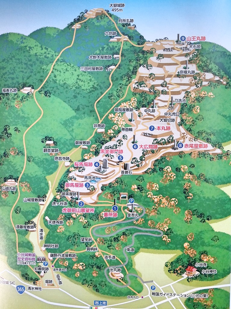 小谷城は標高495mの小谷山の尾根筋に築城されている。ただし頂上495mのところには大嶽城がある。小谷城の最高点は標高約380mのところにある山王丸でここが詰の丸である。その下の京極丸が350m、本丸は330mほどにあたる(Google Map地形レイヤーの等高線から)。ちなみに琵琶湖畔の標高が約85m、小谷山麓が100m。さらに小谷城中腹駐車場は標高260mなので、本丸との比高は70mほど、山王丸まででも120mとなる。